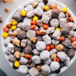 Peanut Butter Puppy Chow is the ultimate snack mix! Crunchy cereal coated in chocolate, peanut butter, and powdered sugar, with Reese’s minis and peanut butter chips for extra indulgence. Totally irresistible!