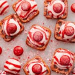 Note 1: To crush candy canes evenly, use a mini food processor or a blender. Alternatively, place the candy cane(s) in a heavy-duty plastic bag, remove the air, and crush with a rolling pin or meat mallet until finely crumbled.Note 2: If the chocolate crumbles, the oven may be too hot, or the chocolate was baked too long. To test, bake one pretzel first. If it crumbles, reduce the baking time. Avoid using convection settings.Storage: Place pretzels in an airtight container at room temperature for up to a week, or keep in the fridge for a slightly firmer texture.