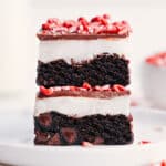 In a large bowl, beat together room-temperature cream cheese and butter until smooth and creamy. Add peppermint extract (to preference; I use 1 teaspoon; see note 1). Add salt, optional food coloring, and powdered sugar. Beat until smooth and creamy. It will seem like it’s not coming together at first, but just keep beating until it does. Scrape the sides as needed with a spatula. Spread frosting evenly over completely cooled brownies. Return brownies to the fridge while preparing the topping.