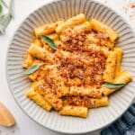 Note 1: Use only 100% pure pumpkin purée, not pumpkin pie filling. Measure out 1 cup; don’t use the whole can.Note 2: Pre-grated Parmesan (especially the kind in a can) is too salty and doesn’t melt well. For best results, grate a block of Parmesan cheese on the small holes of the grater (or on a microplane) for ultra-fine cheese shreds.Note 3: To check if the sauce is ready, dip a spoon in and run your finger across the back. If the line stays visible, the sauce is thickened enough.Storage: This pasta is best enjoyed right after tossing with the sauce. To store leftovers, refrigerate in an airtight container. Add a splash of cream or broth when reheating to loosen the sauce. The texture will be softer but still flavorful. This recipe isn’t ideal for freezing due to the dairy and pasta.