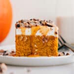 Pumpkin Poke Cake is a soft, spiced cake soaked in sweetened condensed milk and caramel, finished with light whipped cream and a sprinkle of crunchy toffee.
