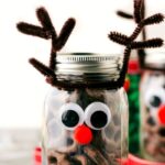 Reindeer Jars make perfect gifts or festive table decorations! Fill a mason jar with chocolate-covered pretzels, then decorate with pipe cleaner antlers, googly eyes, and a red pom-pom nose.