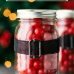 Santa Jars are a festive and creative holiday treat! Fill mason jars with red candy, wrap them in a black ribbon “belt” with a buckle, and secure with hot glue—perfect for gifting!