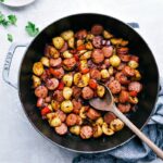 Push everything to the side, add in sausage, and cook another 2–4 minutes, until all oil/butter is fully absorbed, veggies are crisp-tender, and sausage is heated through. Season to taste with salt and pepper. (I add about 1/2 teaspoon salt and 1/4 teaspoon pepper.) Increase any spices as desired. (Spices can greatly vary based on brand, so you might want more.)