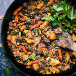 Once the sausage is browned, drain excess grease, leaving 1 tablespoon in the pan. Add veggies and cook for 3–5 minutes until heated through. Add frozen kale, seasonings, and garlic. Cook for 2–3 minutes until fragrant. Remove from heat, serve with grated Parmesan, and enjoy!