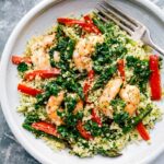 Note 1: This meal generously serves 2 large portions. However, it did perfectly feed my family—2 adults and 2 toddlers. This meal doubles and triples well—just be sure to separate veggies/shrimp to additional pans as needed. If there is more than 1 pan in the oven at a time, cook time will be longer.Nutrition Note: Calories will vary, depending on how much herb sauce you use for the dish.Storage: Keep the herb sauce, couscous, and shrimp separate and store each in the fridge for 3-4 days. Reheat couscous and shrimp separately, then add the herb sauce when serving.