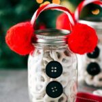 Snowman Jars are a sweet and creative holiday gift! Fill a mason jar with chocolate-covered pretzels, then decorate with a cozy pipe cleaner “earmuff,” red pom-pom accents, and button details.