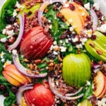 This fresh Spinach Salad recipe has it all! Crisp apples, sweet cranberries, red onion, feta, bacon, and honeyed pecans, tossed with a zesty apple-Dijon-style dressing.