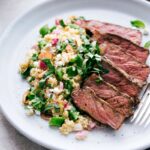 While the steak rests, assemble the salad. In a large bowl, add cooled quinoa, sliced peas, goat cheese, red onion mixture (add it all in, even remaining juices), and basil. Add in dressing to taste; (You may not use all the dressing—add to personal preference—I like a lot!) gently toss the salad. Season to taste with salt and pepper. Sprinkle the almonds on top and serve with sliced steak on the side (cut against the grain).