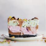 Once the Oreo crust has completely cooled, fill the pan with alternating scoops of cherry, chocolate (or vanilla), and pistachio ice cream. Press each scoop firmly, using the back of the ice cream scooper to ensure the pan is filled evenly. (Optional: add a layer of nuts or dried fruit between each flavor of ice cream.) Level the top, cover tightly, and freeze overnight or until completely solid.