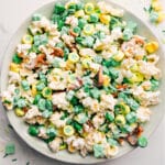 This St. Patrick’s Day Popcorn is a festive sweet and salty snack. Popcorn gets coated in white chocolate and tossed with M&M’s, Lucky Charms marshmallows, and sprinkles.