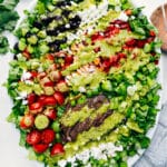 When ready to serve, toss the lettuce, green onions, and tomatoes with half the dressing. Stir in the dried cherries, sliced and toasted almonds, and feta cheese. Add thinly sliced steak on top and drizzle with the remaining dressing (add dressing to desired preference; I like all the dressing on this salad, but you may like less).
