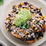Place baked sweet potatoes flesh-side up. Lightly mash the insides with a fork. Spoon on the topping, drizzle plenty of sauce, and add optional toppings (avocado and cotija). Serve immediately.