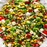 In a large bowl, combine the cooled couscous and corn. Add cherry tomatoes, mozzarella pearls, diced avocado, and fresh herbs (if using).