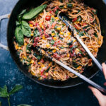 This easy Summer Pasta is bursting with fresh veggies—cherry tomatoes, sweet corn, zucchini, spinach, and roasted red peppers—all tossed in a light cream sauce with spaghetti and Italian sausage for a delicious, restaurant-worthy meal at home!