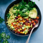 Fill 4 bowls with even amounts of couscous. Divide the roasted sweet potato and bean mixture among the bowls. Add fresh chopped or sliced avocado to each bowl. If desired, add a wedge of lemon to each bowl and thinly sliced or diced jalapeños. Spoon lots of that chilled sauce over everything and enjoy immediately. Store leftover sauce in the fridge for up to a week—it goes great on salads, with veggies, etc.