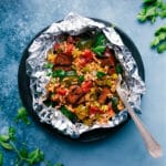 Divide the mixture evenly among the 4 prepared sheets of foil. (This comes out to a heaping 1 and 1/2 cups (330g) per packet.) Seal the foil packs tightly so no air escapes, but there is still room for steam to circulate (see note 2).To seal the foil packet, bring the short sides together in the middle and gently fold down to completely seal. Then, roll up the ends.