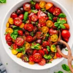 Simple yet delicious, this fresh and seasonal Tomato Salad Recipe has a mix of ripe cherry and vine-ripened tomatoes, fresh basil, and an olive oil dressing.