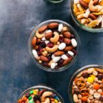 Mountain Trail Mix: Combine 1 cup peanuts, 1 cup pretzels, 1/2 cup peanut butter baking chips, and 1/2 cup Reese’s pieces to a large bowl and toss to combine. Transfer to storage containers.
