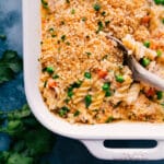 Note 1: This recipe works best with rotini pasta—it’s the best at soaking everything up and bakes through perfectly in the specified time. Other pasta shapes may hide the flour so the dish won’t properly thicken. If using other pasta shapes, whisk the flour with 1/4 cup of the chicken stock/broth first before adding to the casserole dish. Ensure whatever pasta is being used has a similar boil time to rotini (9–11 minutes).Note 2: The better the chicken stock, the more flavor this dish will have. I love and use Swanson’s chicken stock. If using chicken broth, you may need a bit more seasoning.Note 3: For prepping milk, remove from the fridge, measure, and set aside before starting to cook. Room-temperature milk will heat quicker! This is intended to be a creamy recipe, and the lower-fat milk choices won’t achieve the right texture. That said, you can use 1% or 2% (for a less creamy dish). Unfortunately, skim milk or dairy milk alternatives don’t work the same in this recipe.Note 4: Use 12 ounces of whatever frozen veggie you like best—all peas, peas and carrots, all corn, or peas and corn.Note 5: Optional panko topping: Melt 2 tablespoons butter in a large pan over medium-high heat. Once melted, add in panko and salt to taste; I add a heaping 1/4 teaspoon. Stir constantly until lightly browned, then sprinkle over the casserole. Don’t want to use stovetop/pan? Just melt butter in the microwave and mix panko through with heaping 1/4 teaspoon salt.Storage: Leftover Tuna Casserole keeps well in an airtight container in the fridge for 3–4 days. It does thicken and become less creamy as it sits (pasta continues to absorb surrounding liquid). Because of the dairy in this casserole, it isn’t a great candidate for freezing and thawing. The milk solids will separate as it thaws, resulting in a grainy texture with some separation, and the pasta bloats and becomes mushy.