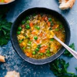 Note 1: Be sure to dice these veggies fairly small (use a food processor for ease/speed). Really take the time to thoroughly sauté these veggies for best soup flavor and to ensure they’re completely tender.Note 2: The better the stock, the better the soup will taste. I highly recommend Swanson® chicken or vegetable stock! This amount of stock results in a thick soup (which I love). If you’d like it thinner, add a touch more.Note 3: The rind on Parmigiano Reggiano is a protective layer that develops on the outside of the cheese wheel as it ages. It’s technically edible but becomes tough to chew and very hard. That said, these rinds are packed full of flavor and do wonders for enriching the flavor of sauces, soups, stews, etc. Throw one in if you have the chance— you are going to love what it adds! Tip: Check your local cheese counter at the grocery store (anywhere they carve big wheels of Parmesan to sell in smaller pieces). Ask to purchase a rind, and they may sell you just the rinds at a reduced rate!Note 4: Try some of these optional serving suggestions: 3–4 sprigs fresh thyme, Parmesan cheese, and/or hearty buttered bread.Note 5: I like grating a touch extra of Parmesan with a fine grater right on top of individual bowls. This gives the cheese the best possible texture, and it melts beautifully into the bowl of soup.Nutrition Note: Nutrition information does not include optional ingredients, including the Parmesan rind and cooked chicken.Storage: The longer this soup sits, the thicker it gets. The pasta will continue to absorb liquid until there is practically none left. For this reason, this soup is best enjoyed right after being prepared. If you have leftovers, note the pasta will be bloated a bit (still tasty!). Thin leftover soup with additional chicken or vegetable stock.