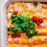 Note 1: Use a mild enchilada sauce you know you like! My family loves mild red enchilada sauce by Old El Paso best.Storage: Store leftovers in a sealed container in the fridge for up to 4 days. Reheat in the oven at 350°F or microwave until warm. To freeze, wrap well and store for up to 3 months. Thaw in the fridge before reheating.