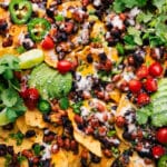 Once nachos are out of the oven, drizzle sour cream sauce on top. Add diced avocado or guac (I add guac to a bag, cut off the tip, and pipe over nachos). Sprinkle with chopped green onions and/or cilantro. Add any other desired toppings. Serve immediately. Nachos are the very best right out of the oven!