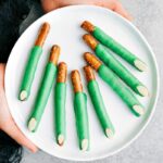 Separate green chocolate candy melts into 3 microwave-safe bowls and optionally add vegetable oil or shortening to each bowl (not essential, but makes it easier to coat pretzels). Melt one bowl of chocolate at a time in the microwave in 15-second bursts, stirring vigorously for 10 seconds between bursts, until melted and smooth.
